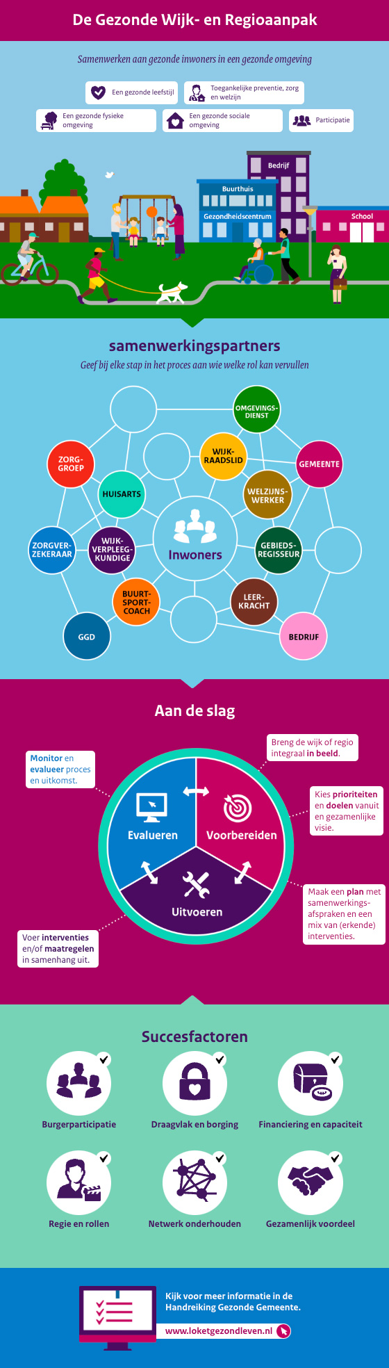 De infographic Gezonde Wijkaanpak van het Loket Gezond Leven geeft in één oogopslag de belangrijkste onderdelen van de Gezonde Wijkaanpak weer en ondersteunt bij het samen werken aan integraal gezondheidsbeleid.